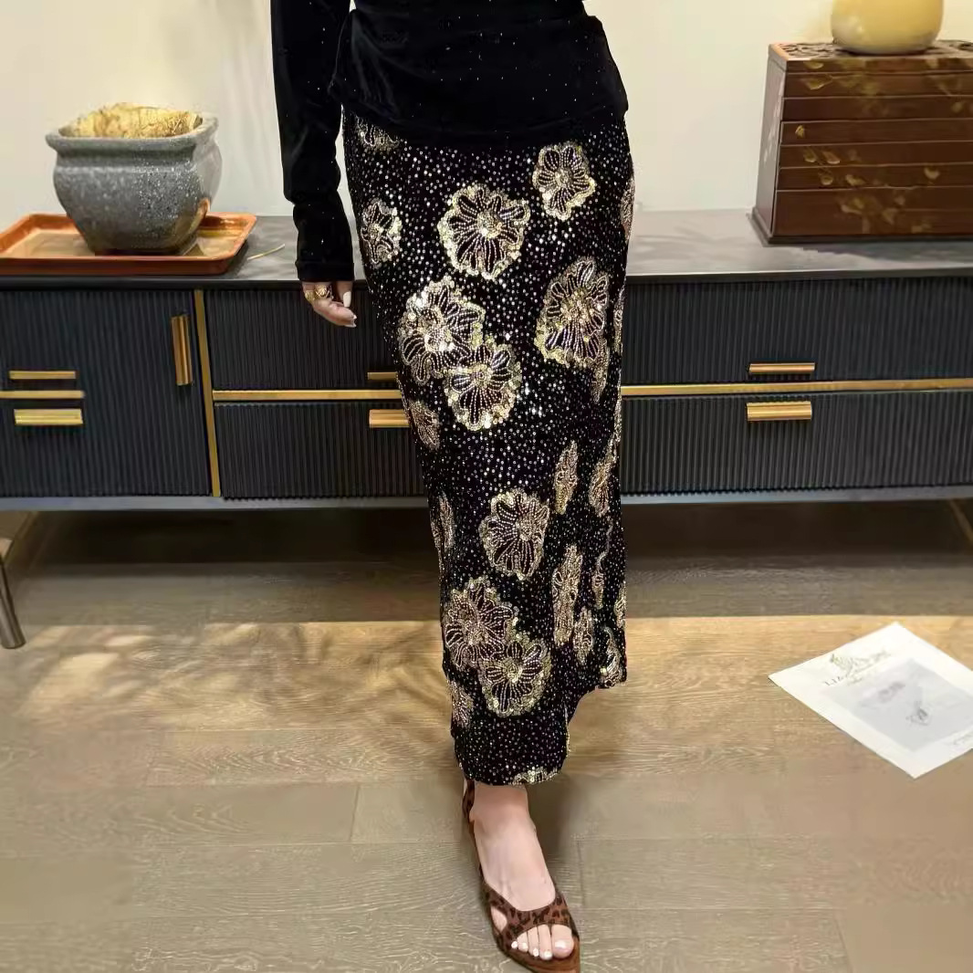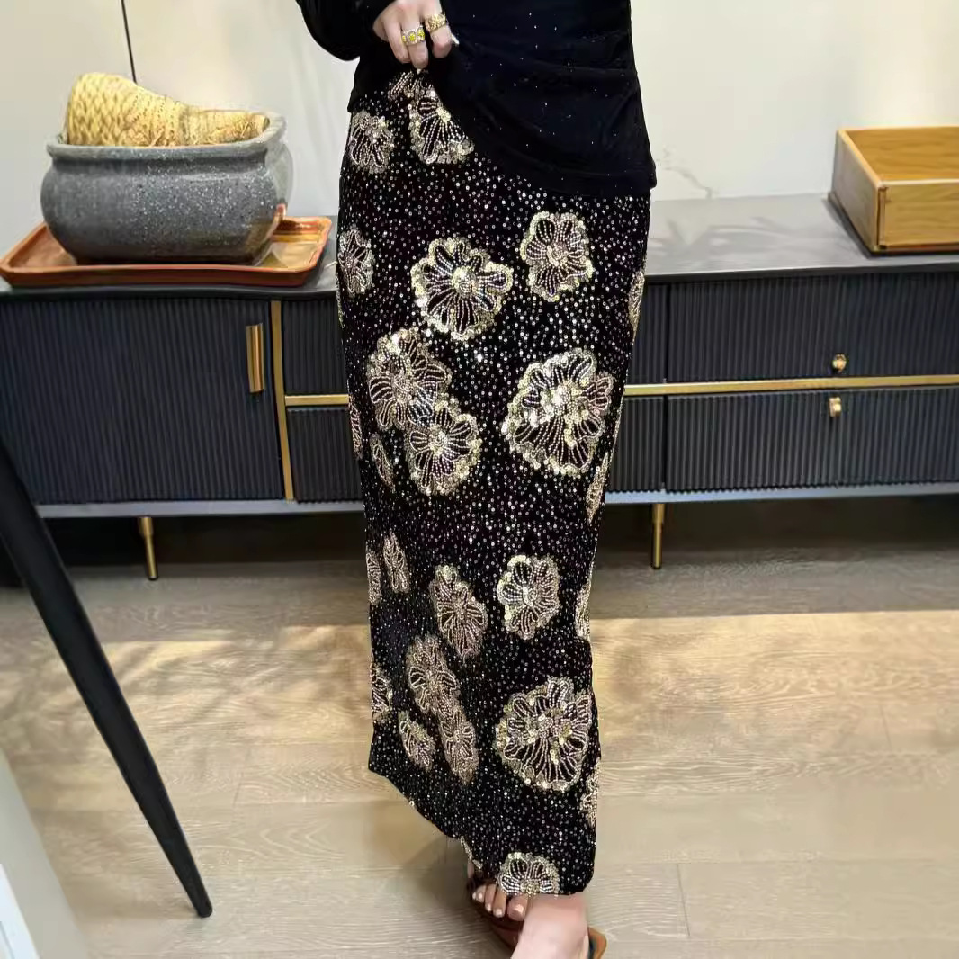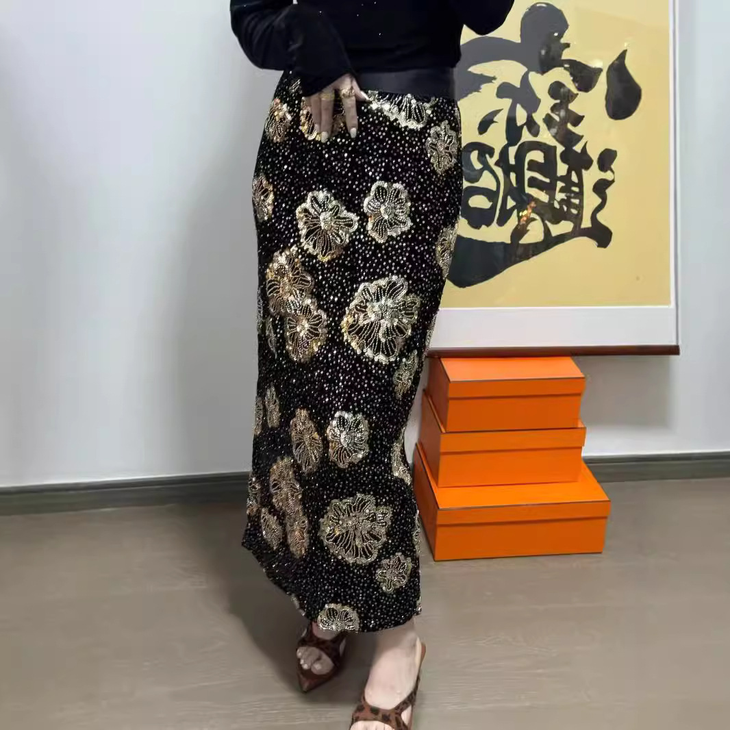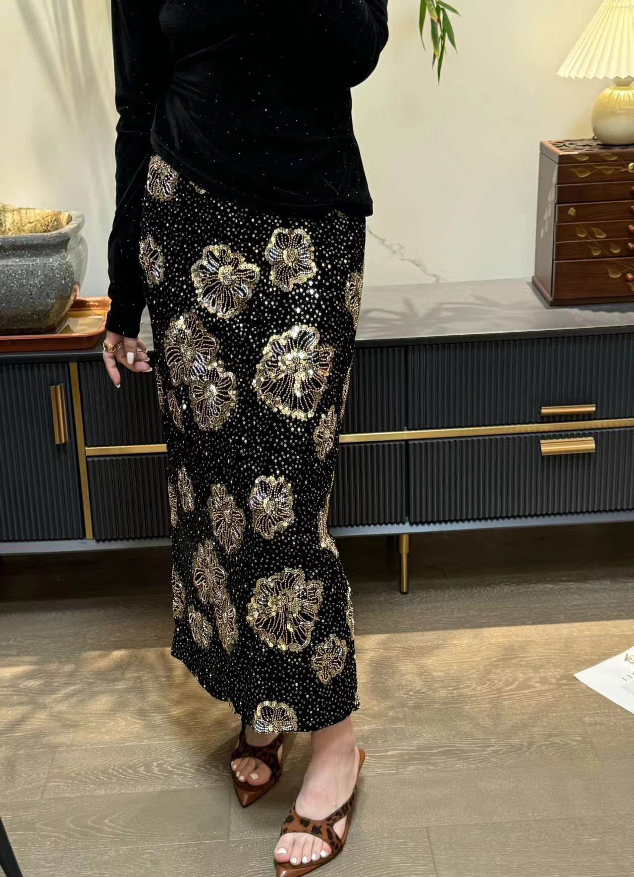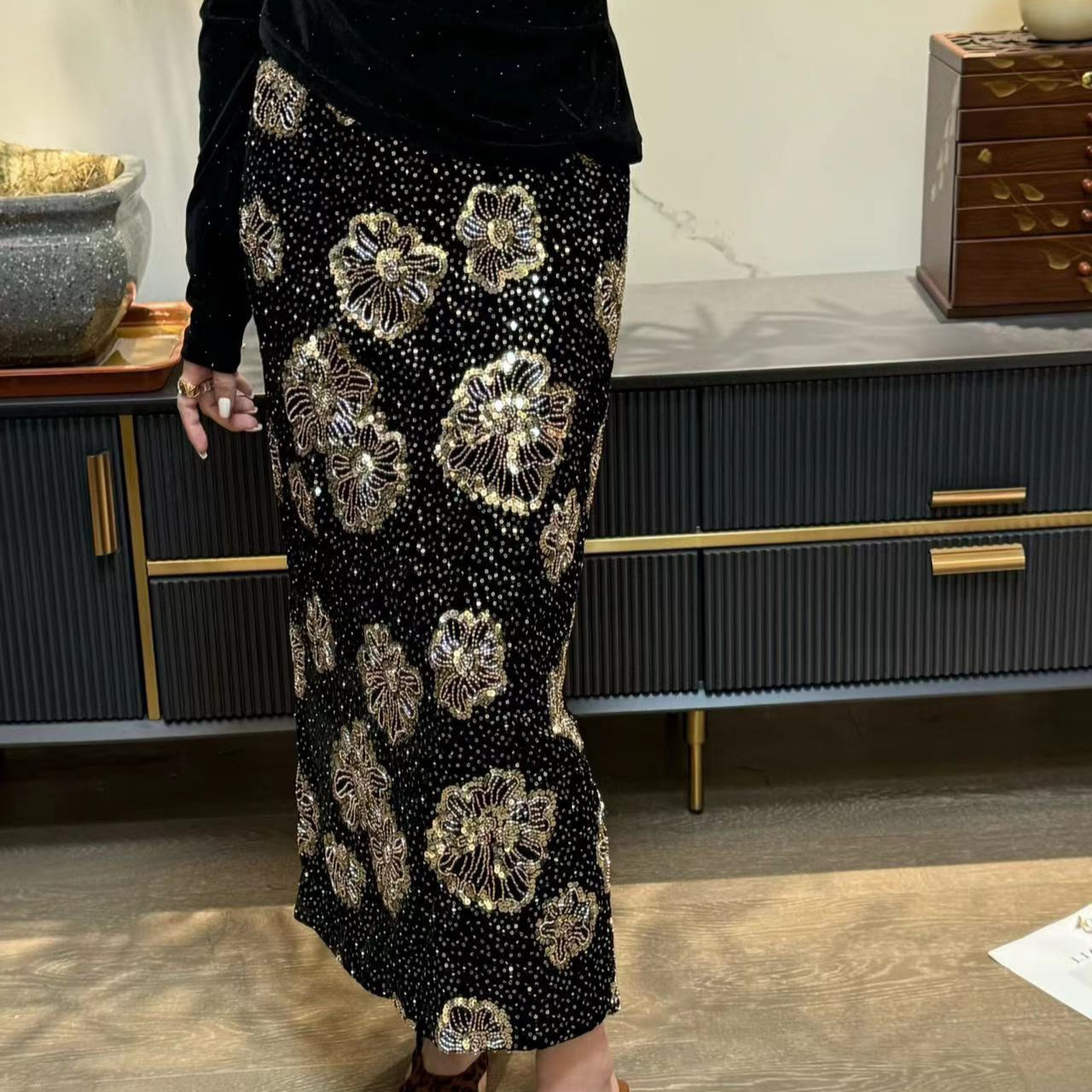 • Heavy Embroidery Sequins Velvet Bottom Beaded Fashionable Temperamental All-match Skirt