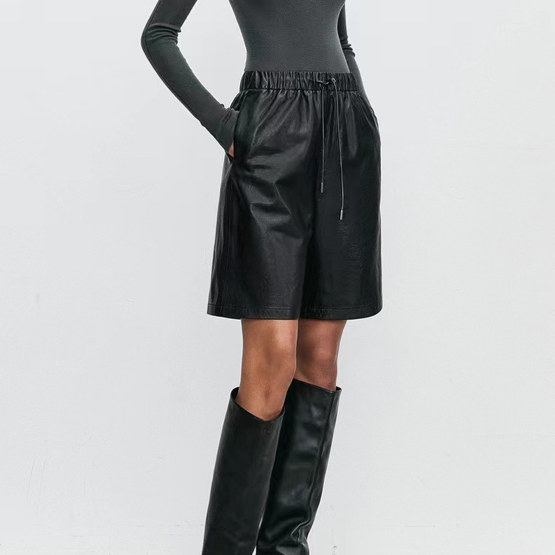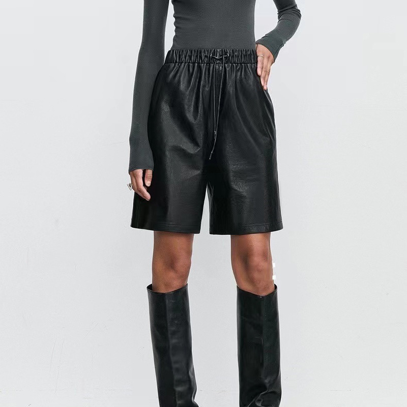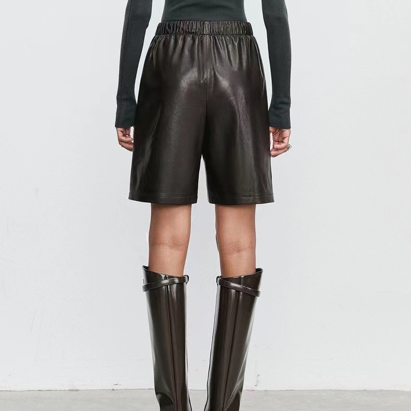 • Sheepskin Elastic Waistband All-match Casual Straight-leg Leather Shorts Women