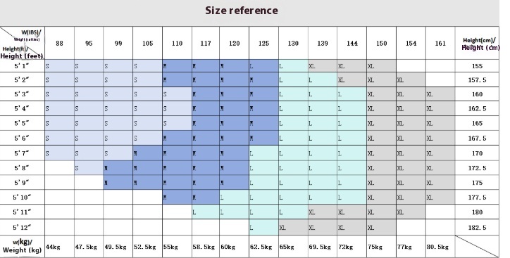 Size: S (44.00kg-52.50kg,M (52.50kg-62.50kg,L (62.50 kg-70.00kg)