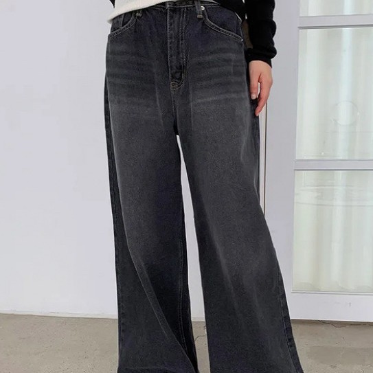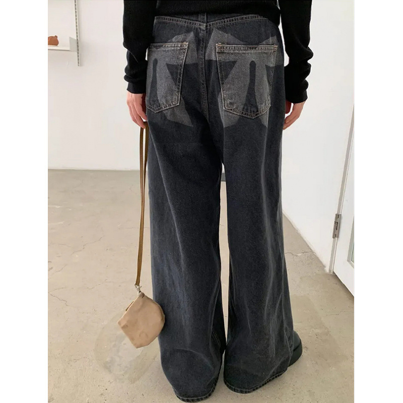 Washed And Worn Wide Leg Jeans With Bow Print At The Back