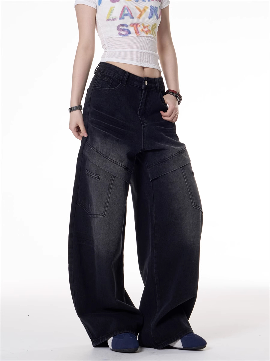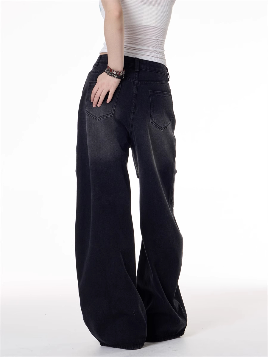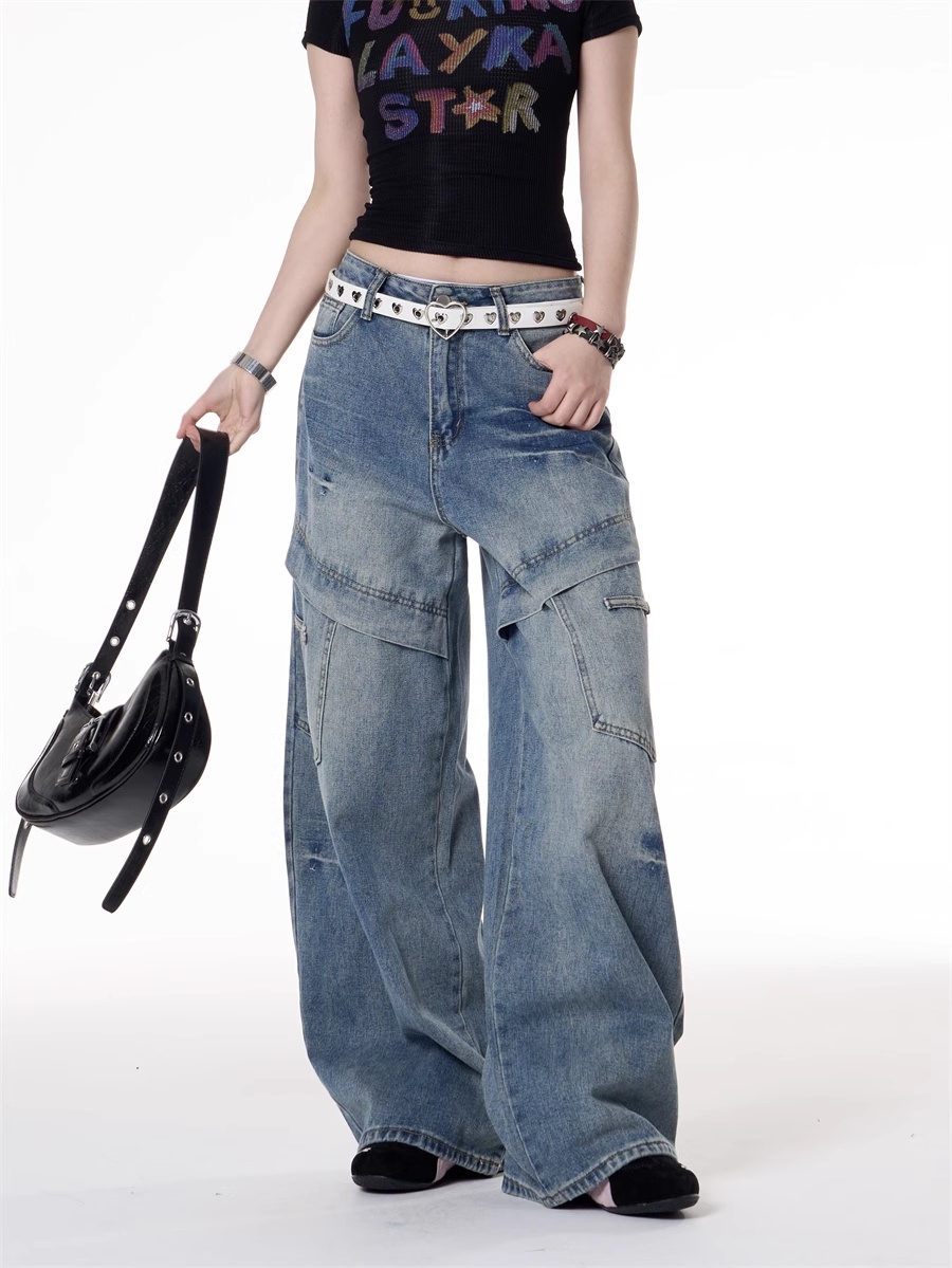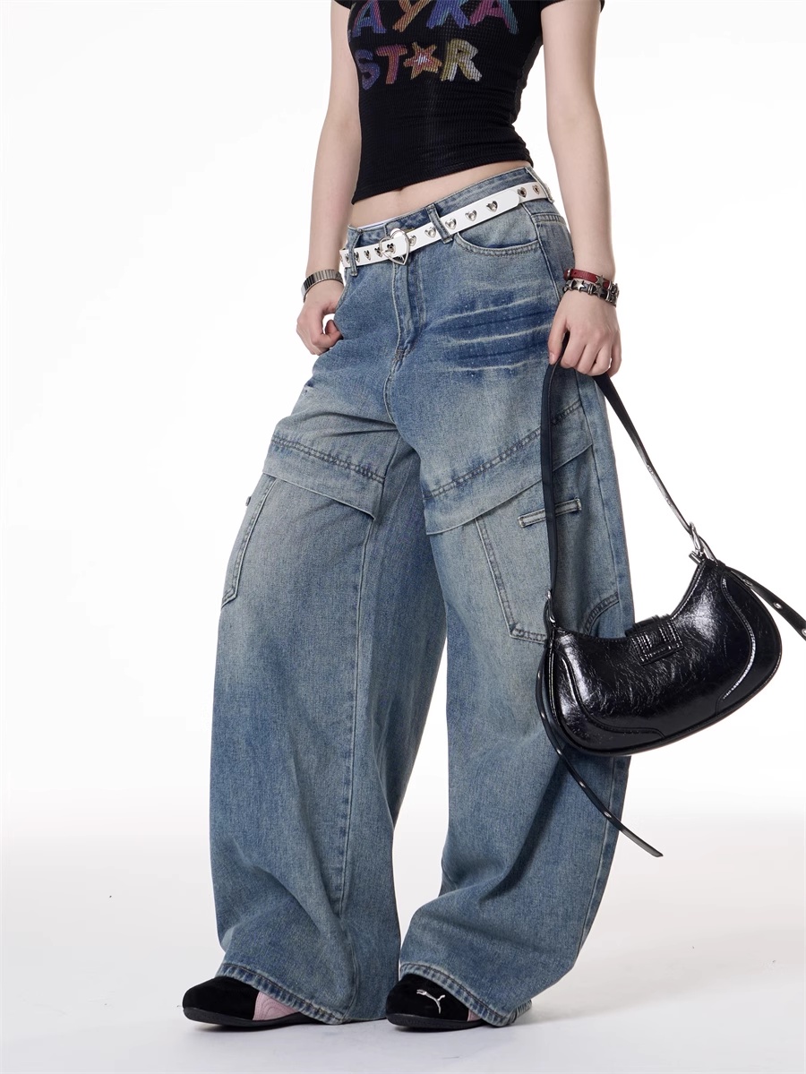 American Retro Hot Girl Style Multi-pocket Deconstructive Design Jeans