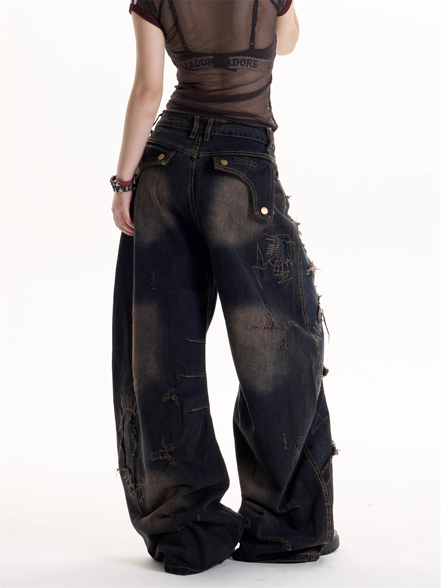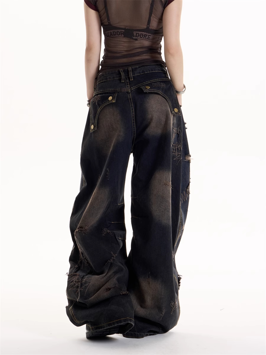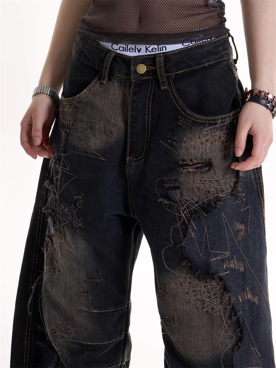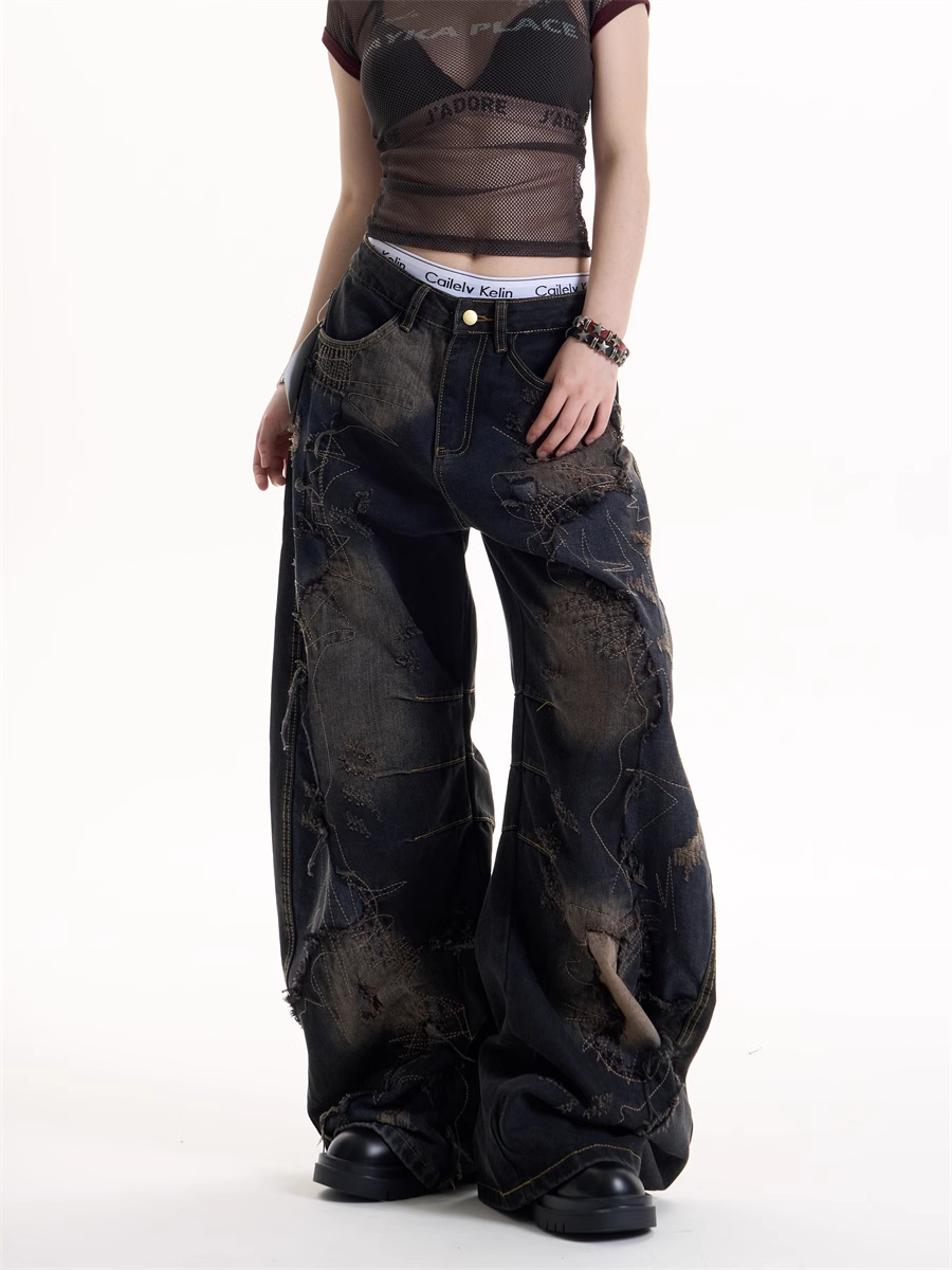 American Retro Hot Girl Wind Black Tie-dyed Ripped Jeans
