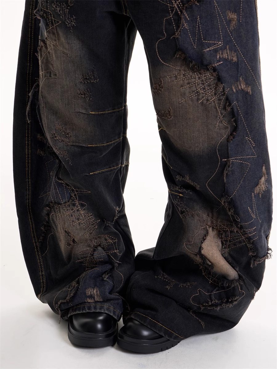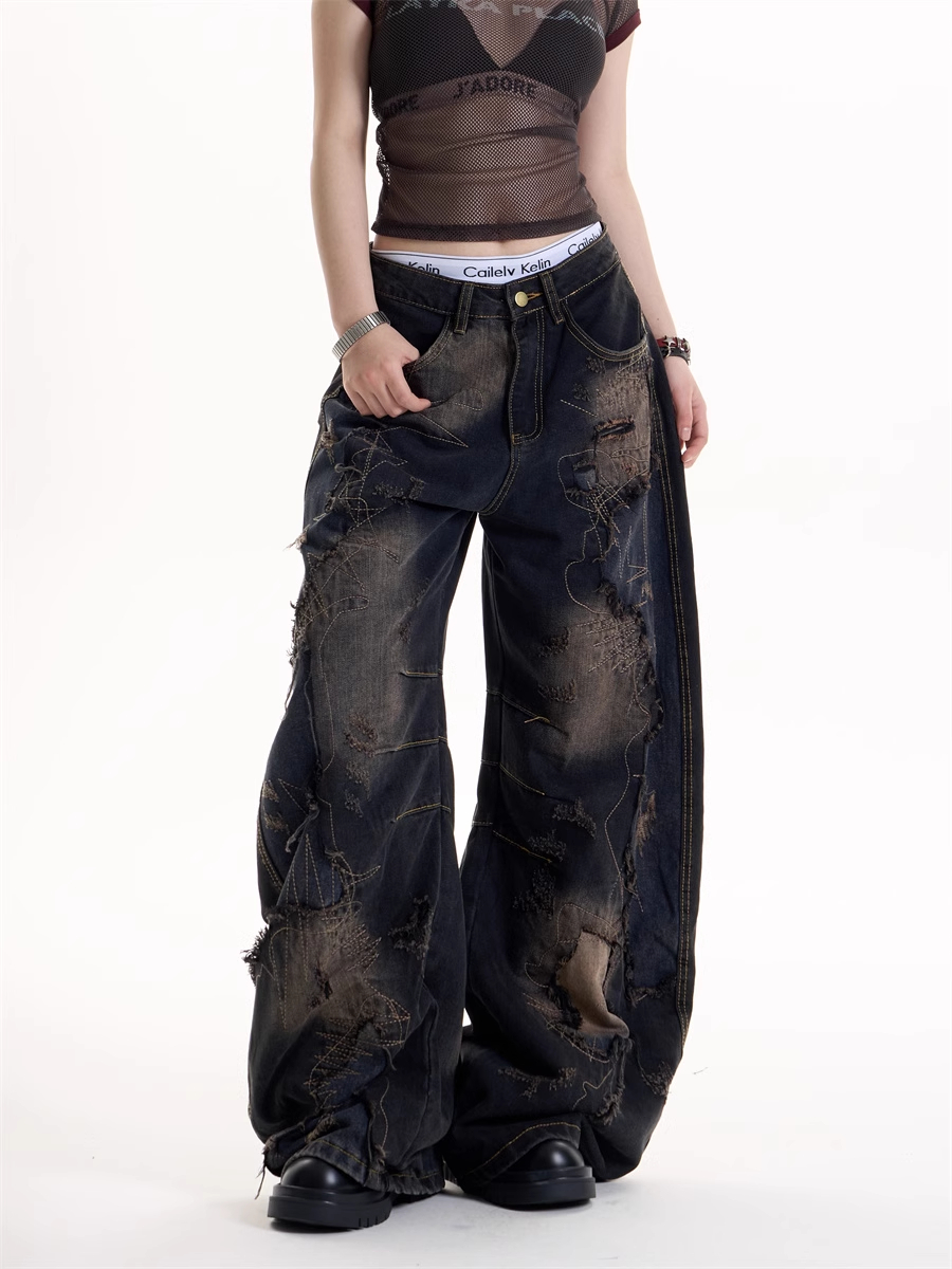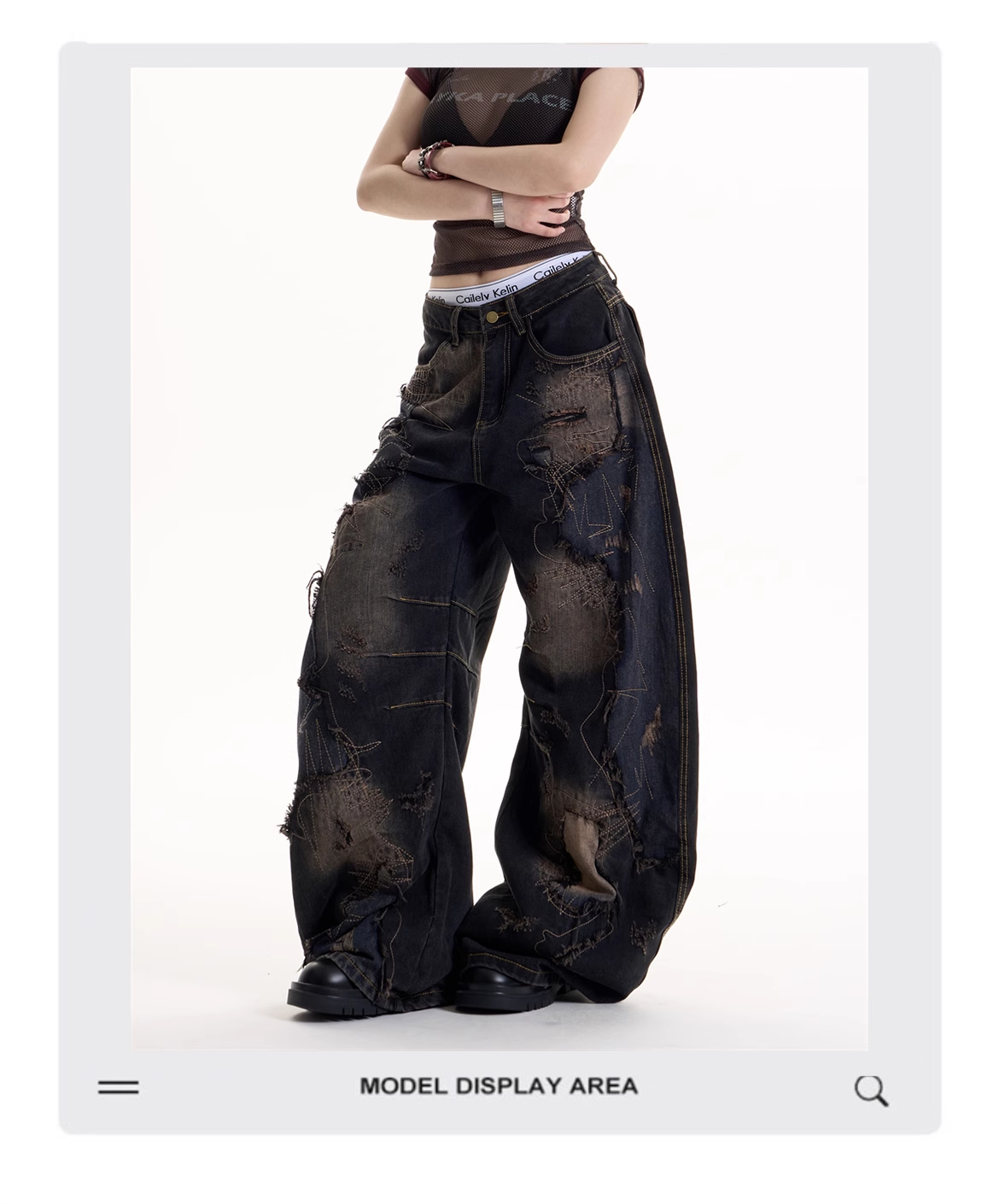 American Retro Hot Girl Wind Black Tie-dyed Ripped Jeans