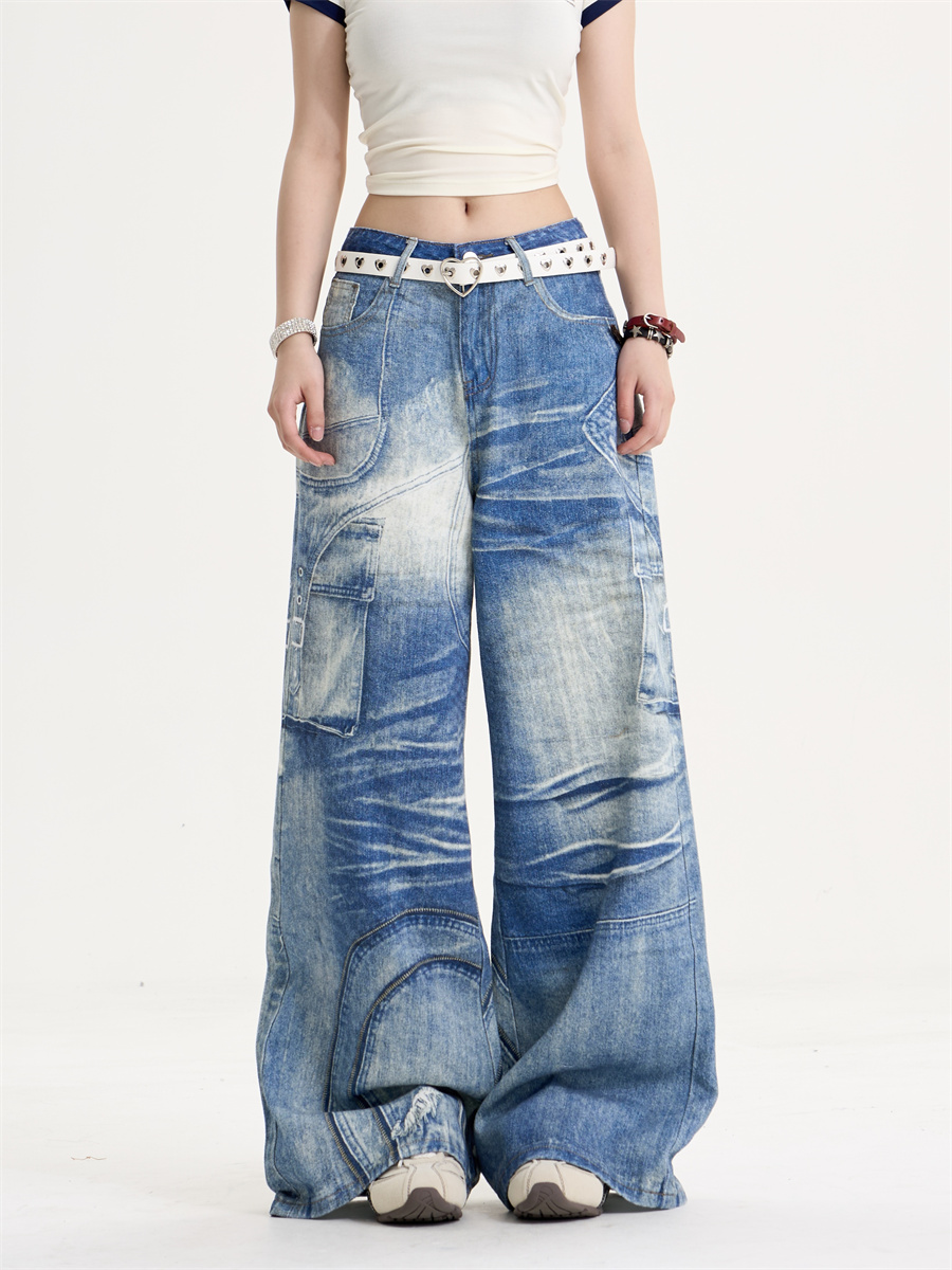 • American Retro Sweet Cool Printed Wide-leg Jeans Women's Loose Slimming