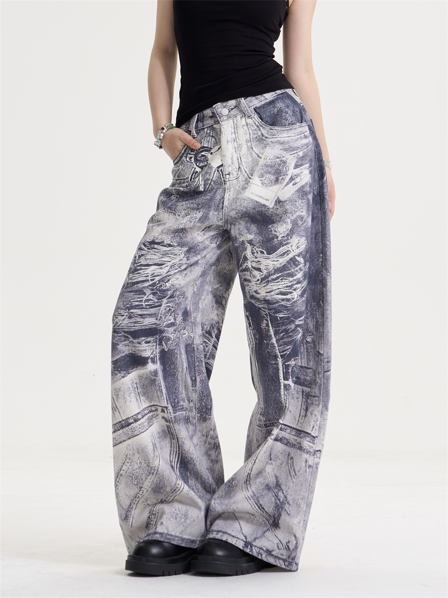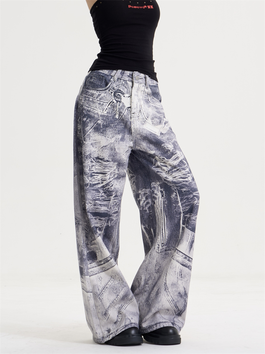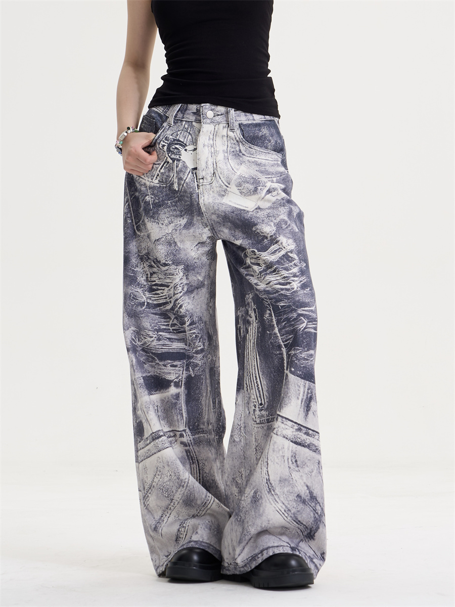 • American Style Retro Washed Distressed Printed Gradient Jeans Women's Loose Straight