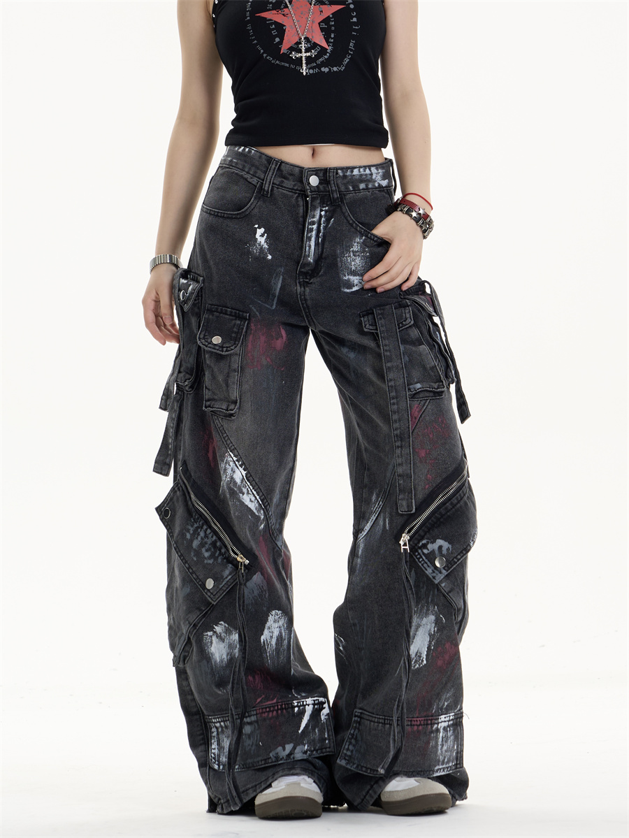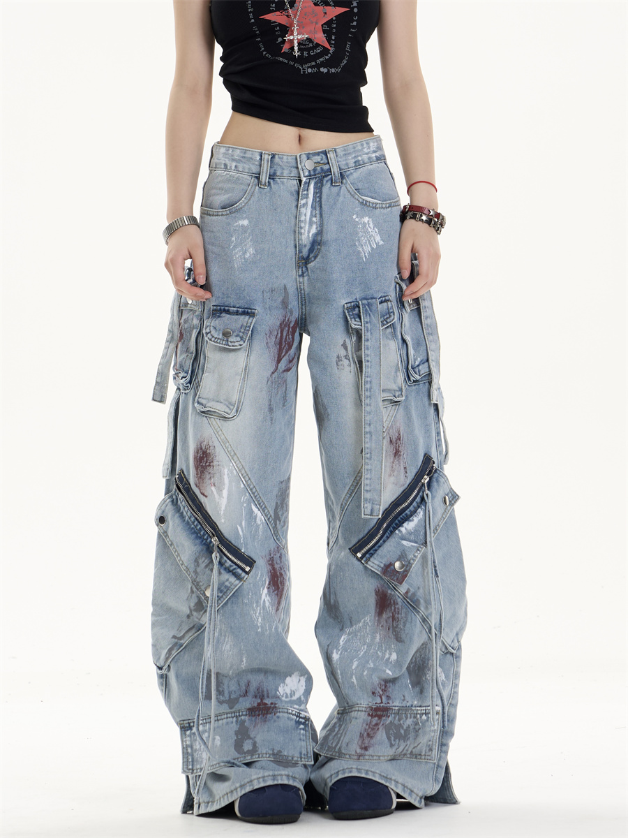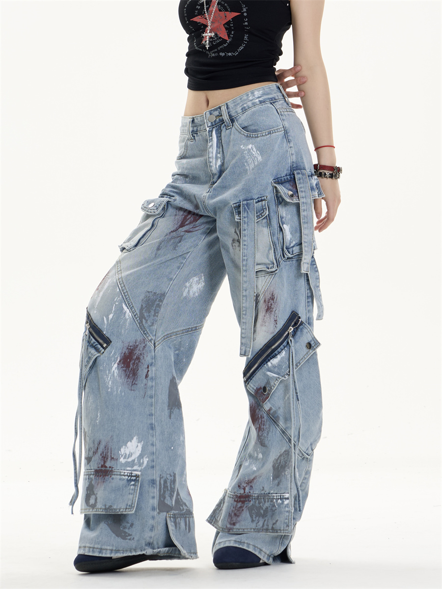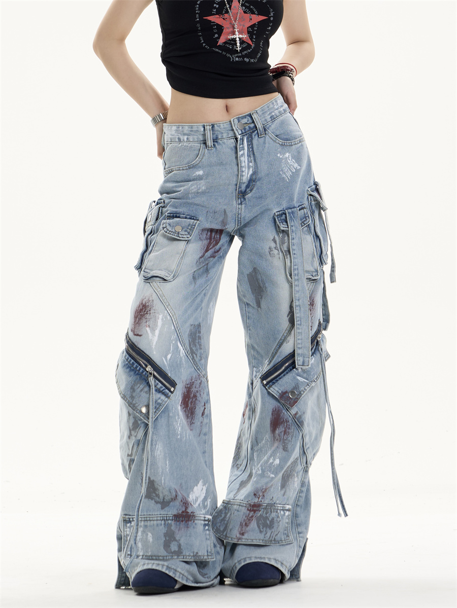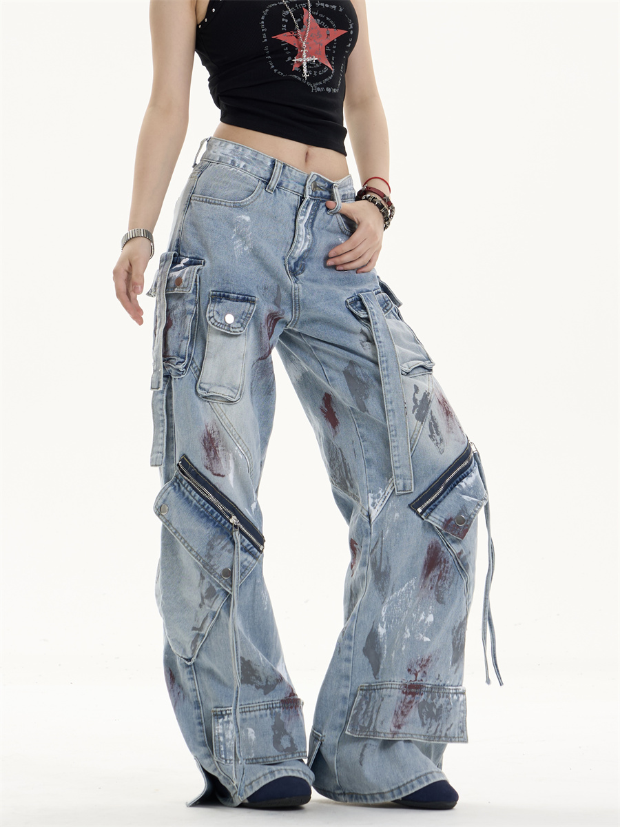 Multi-Pocket Workwear Jeans Women's Loose Wide-leg Pants