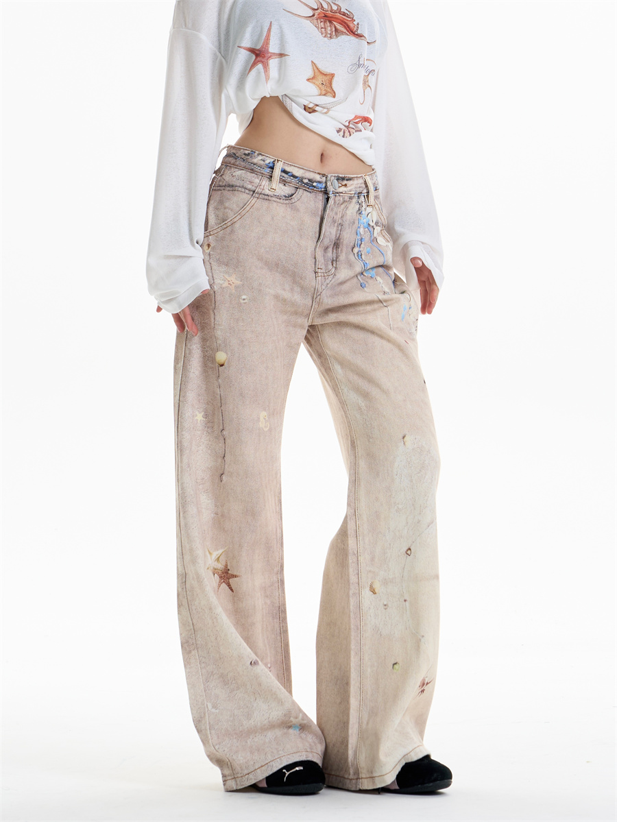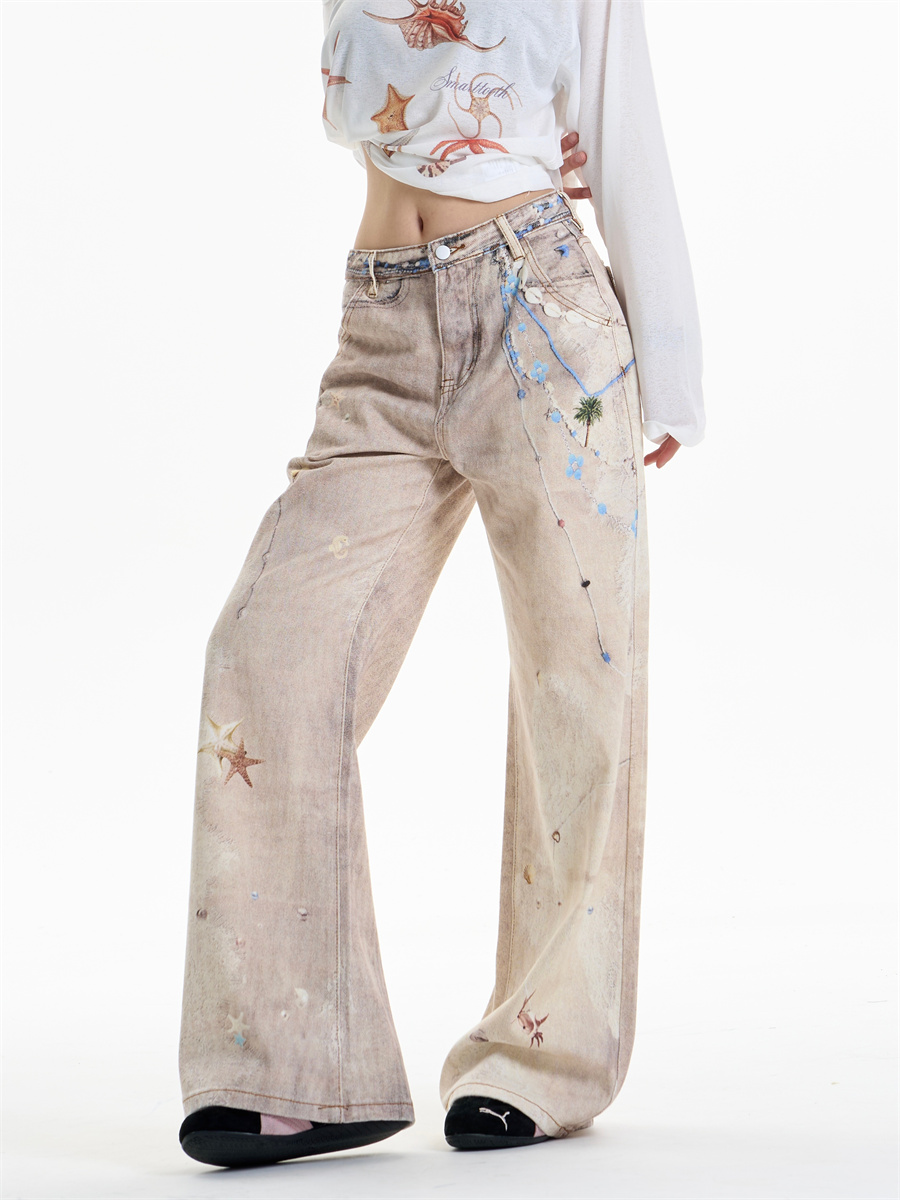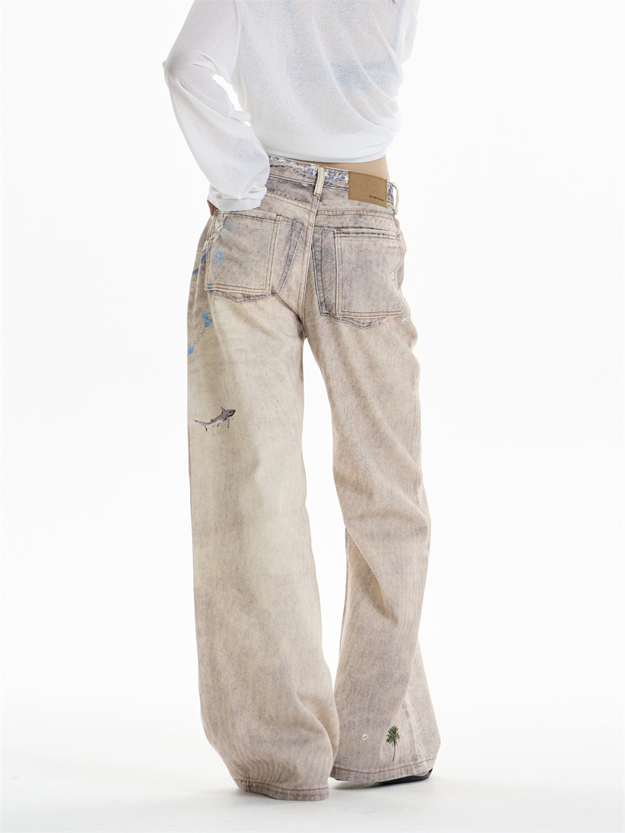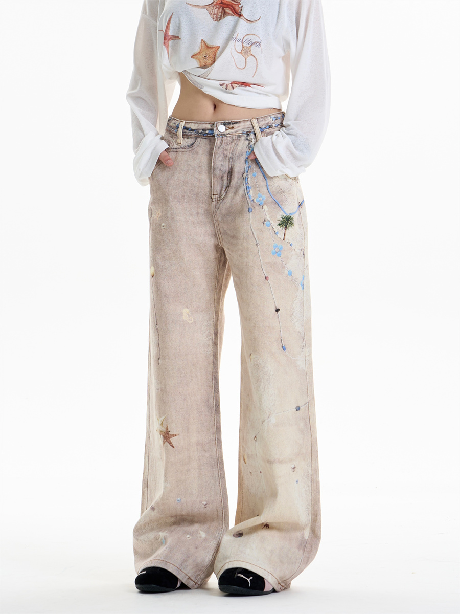Retro Chain Print Worn Jeans Women's Straight Wide-leg Pants