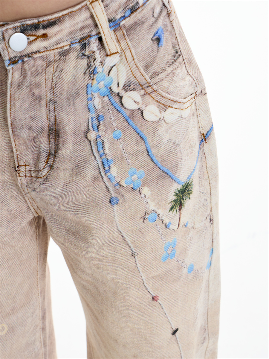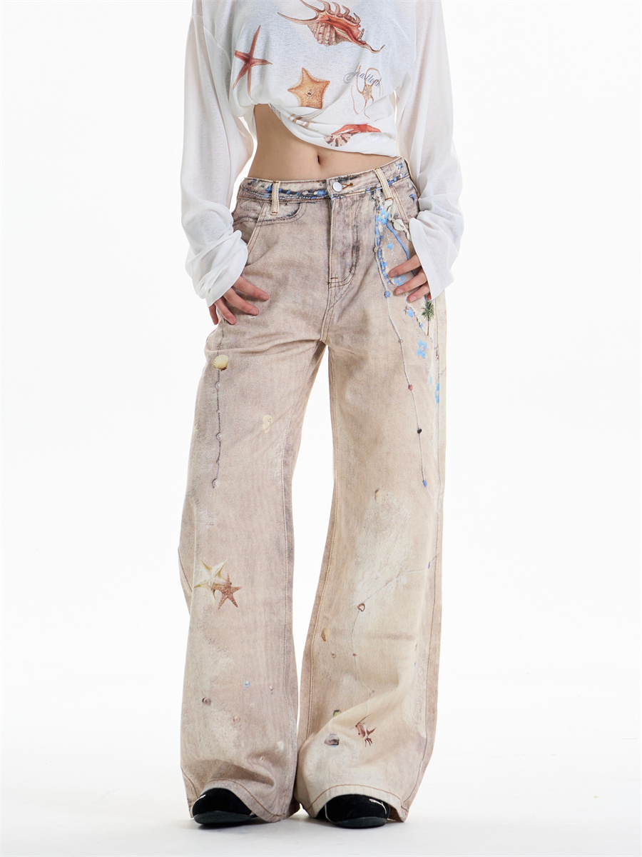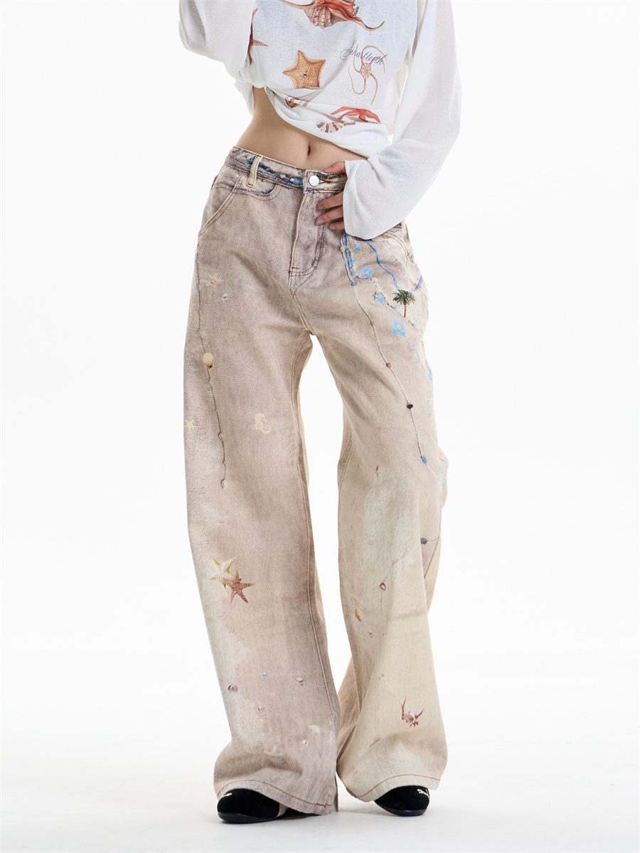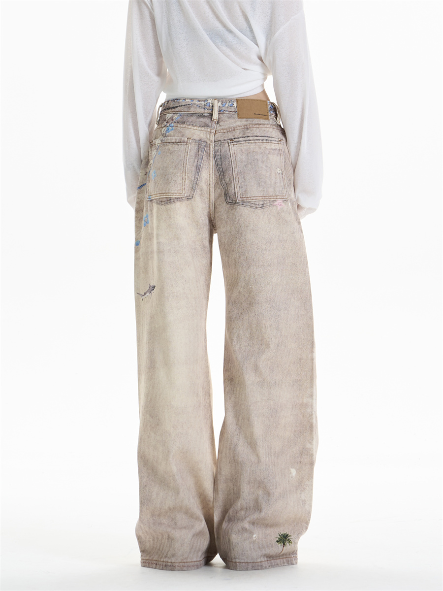 Retro Chain Print Worn Jeans Women's Straight Wide-leg Pants