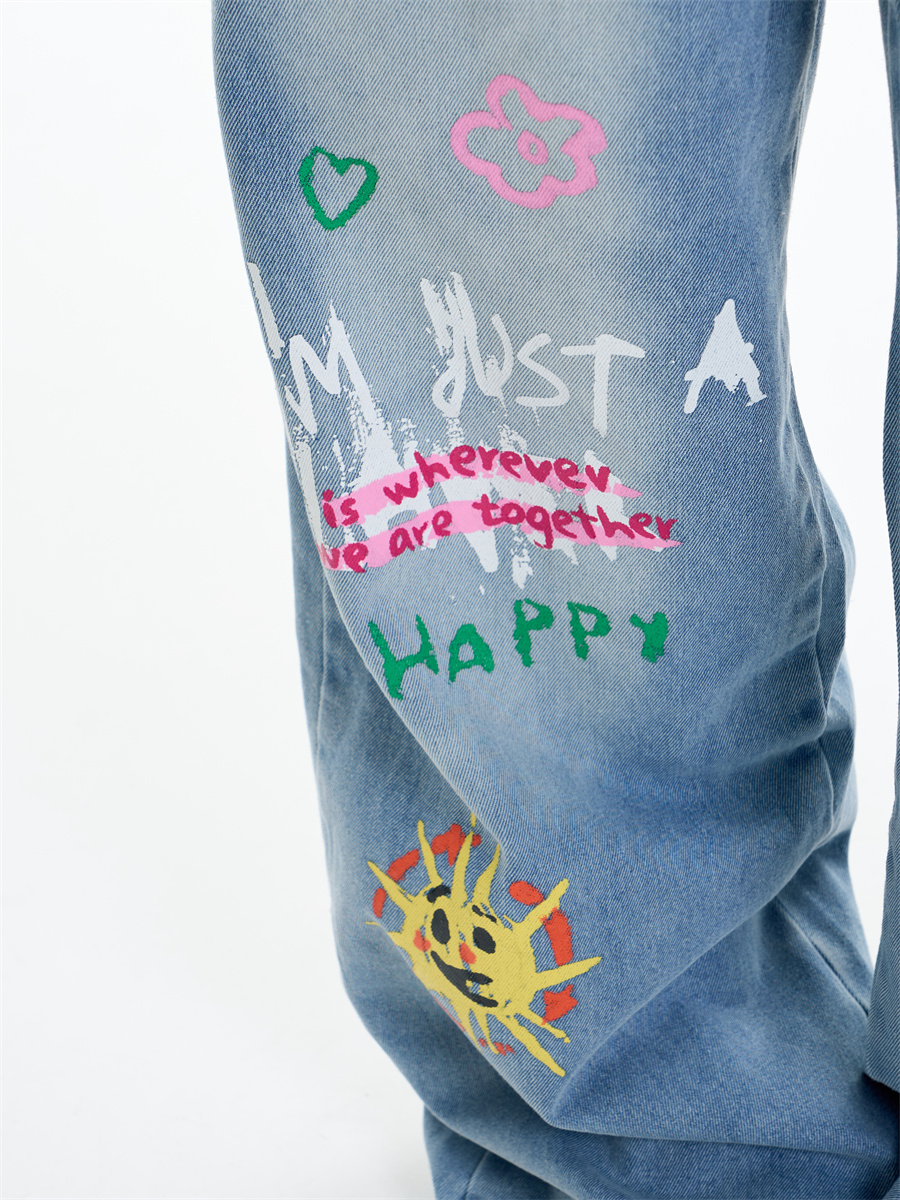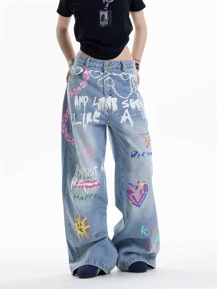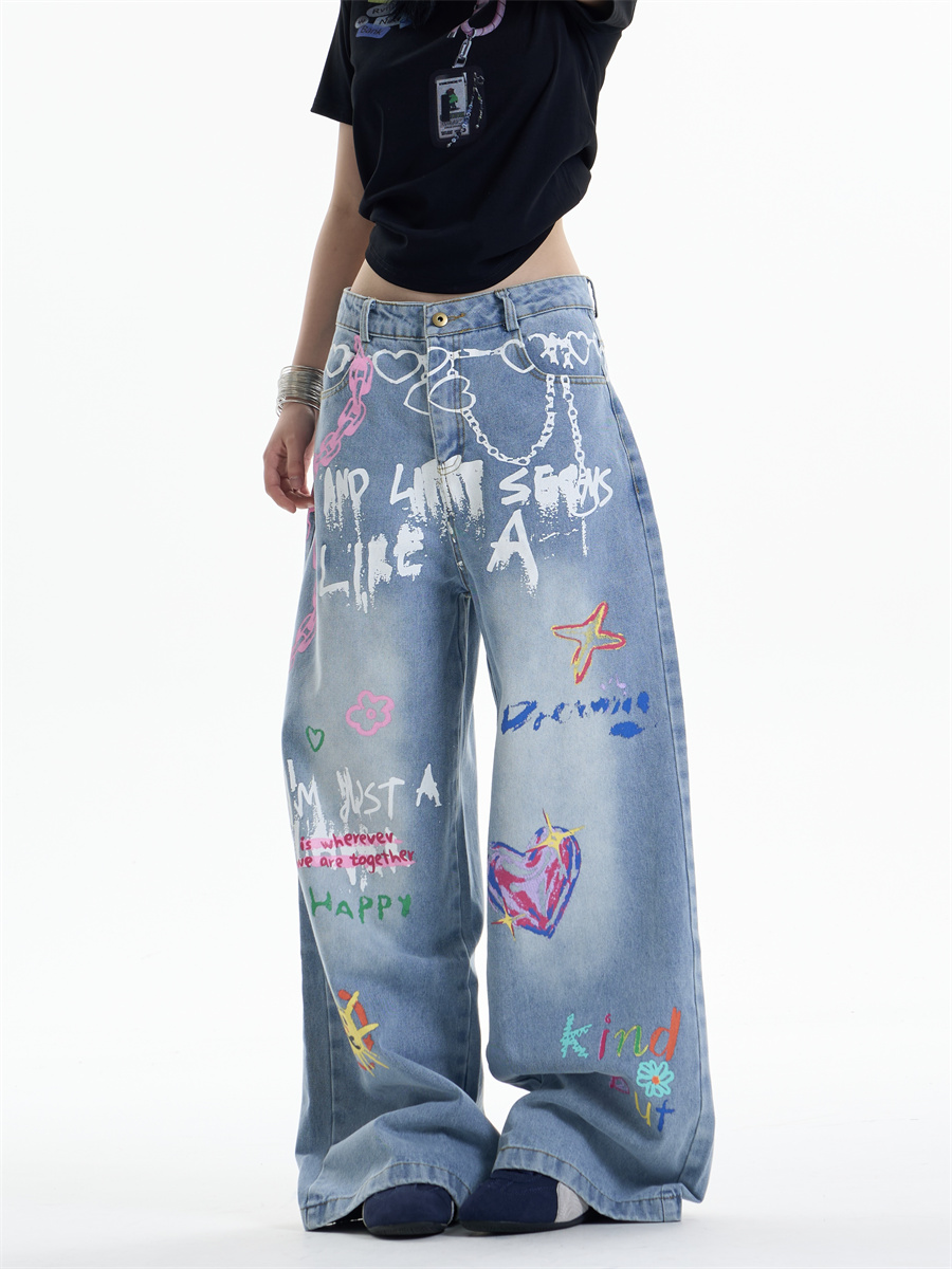 Waist Chain Printed Jeans Women's Straight Wide-leg Pants