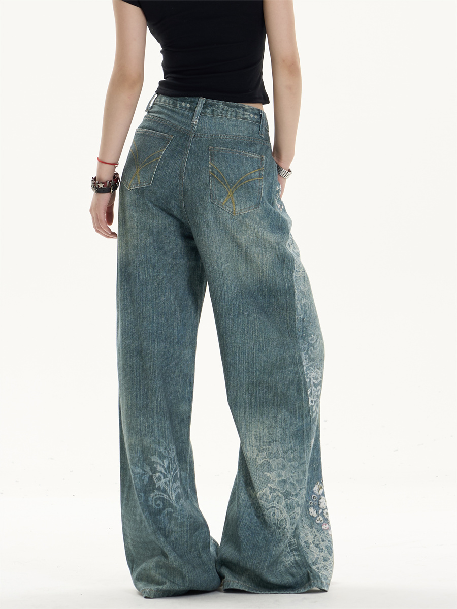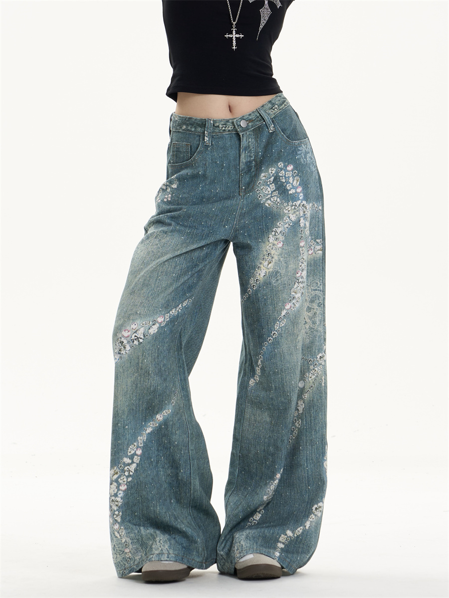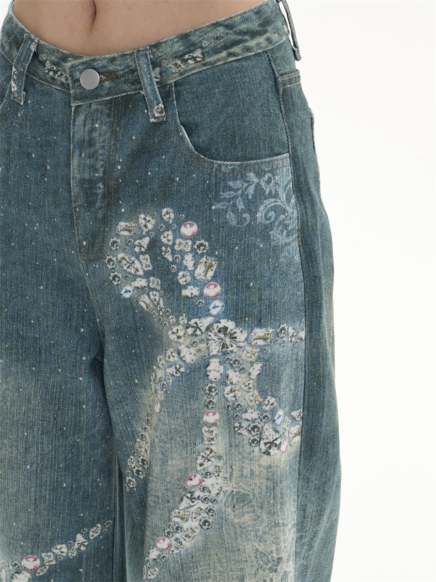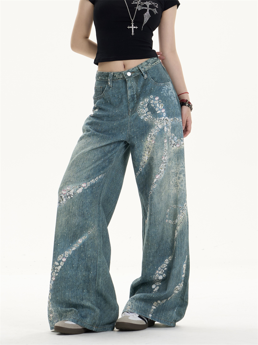 Women's Bowknot Printed Jeans Loose Wide-leg Pants