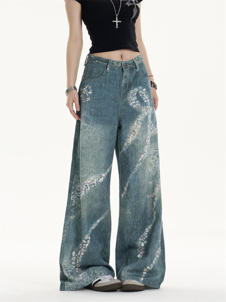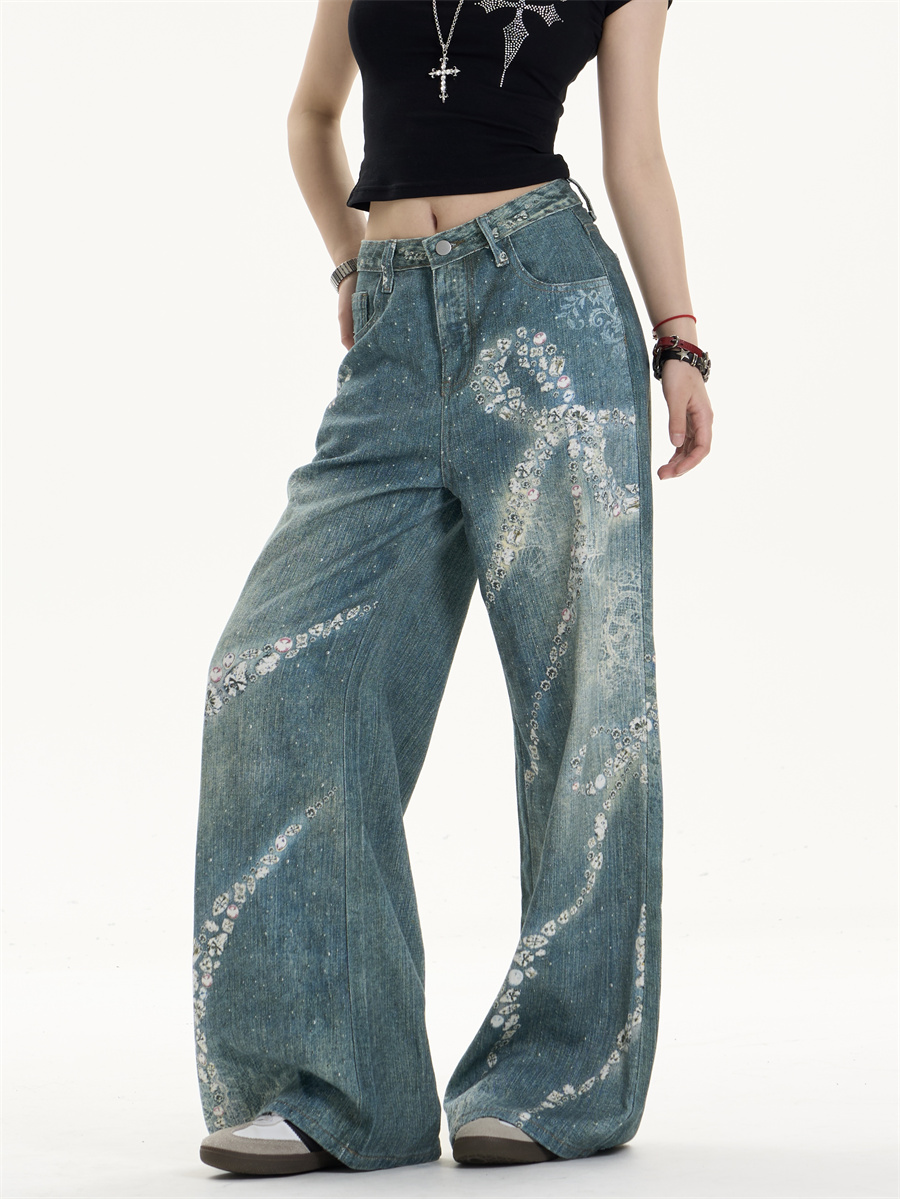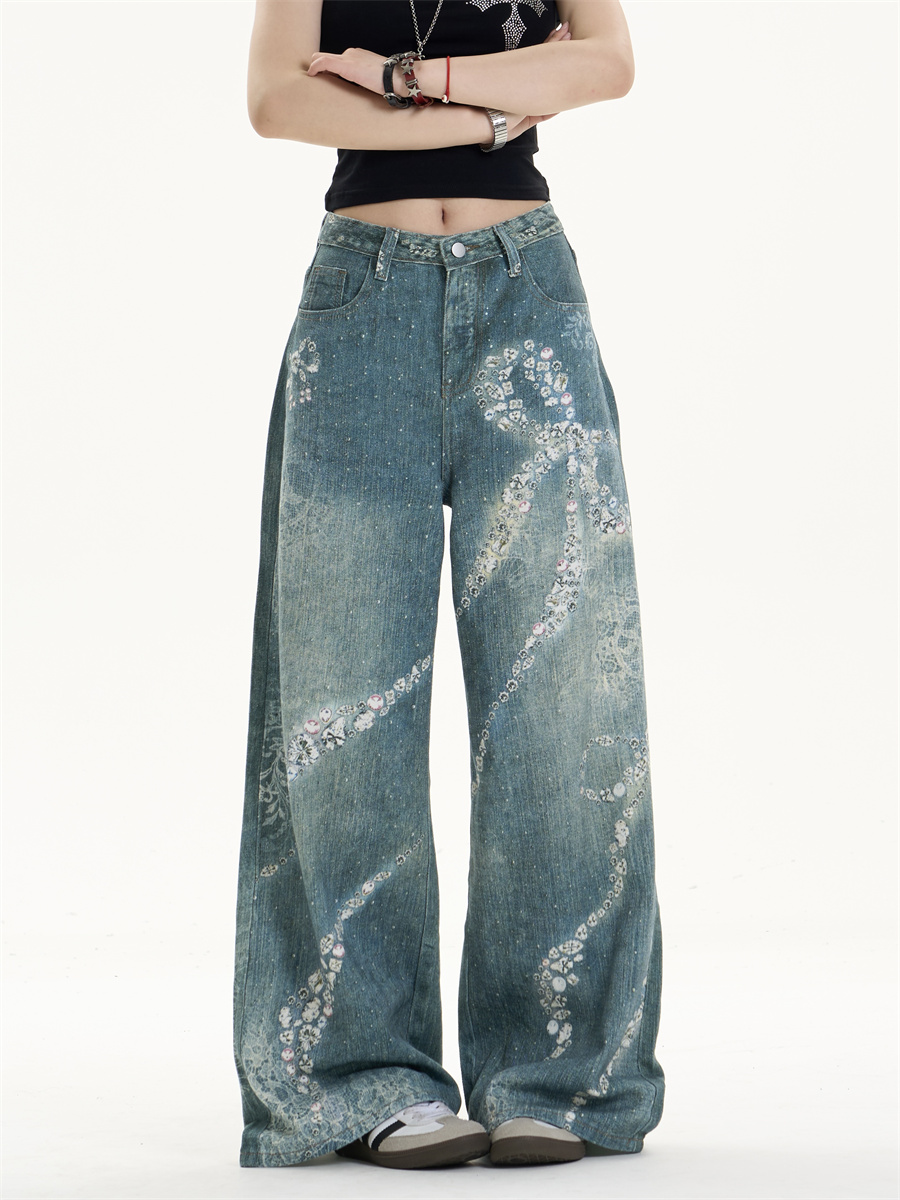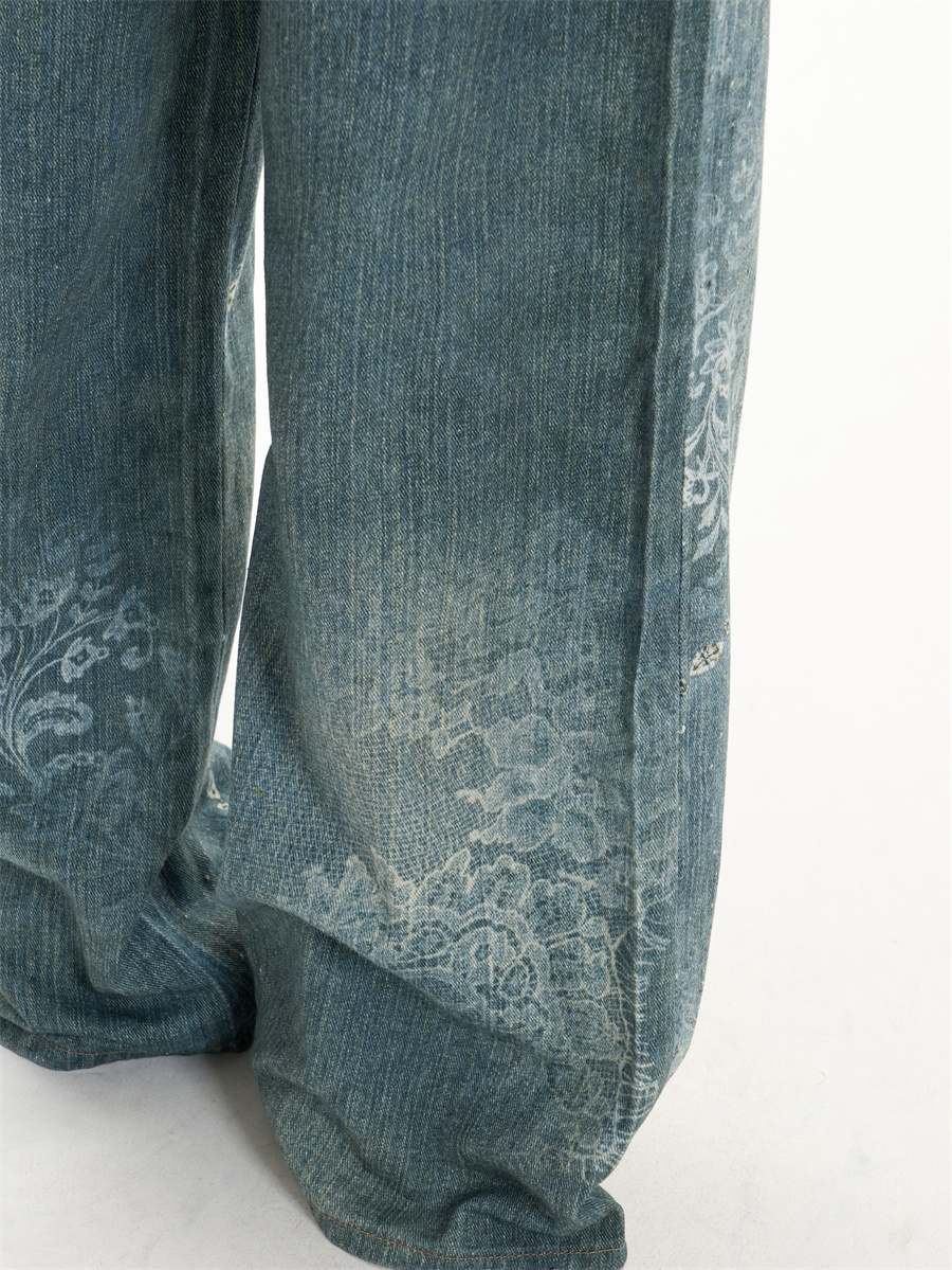 Women's Bowknot Printed Jeans Loose Wide-leg Pants