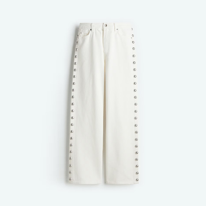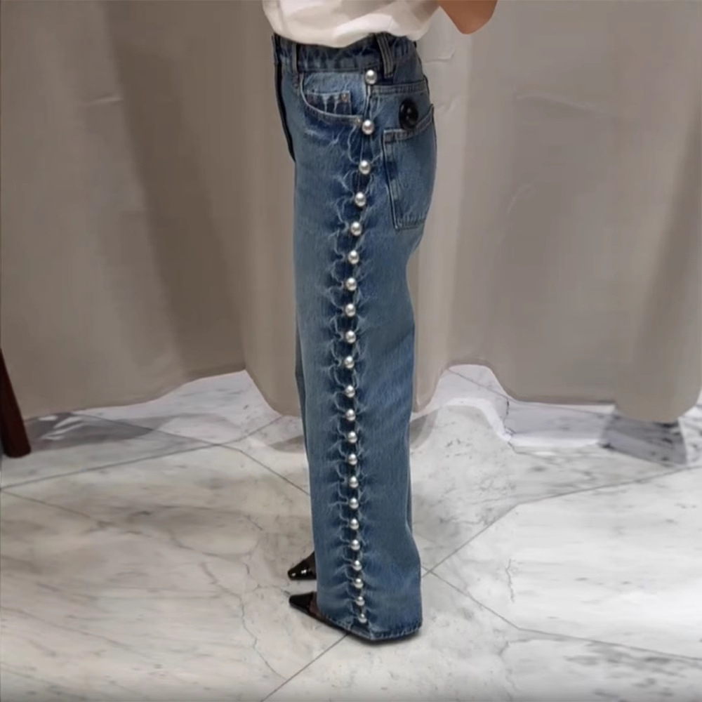 Color: dark blue side round beads decorative jeans, white side round beads decorative jeans