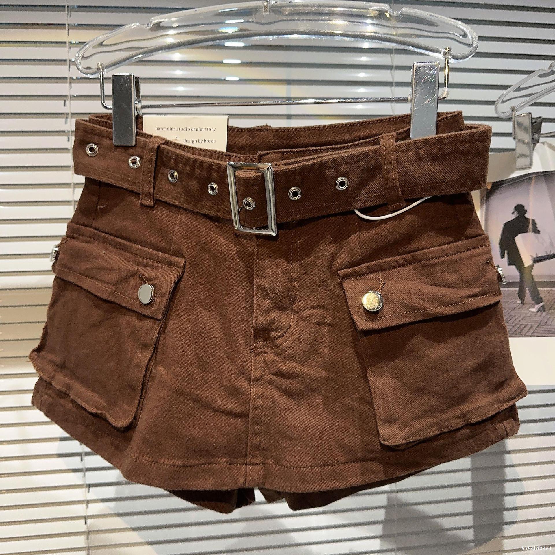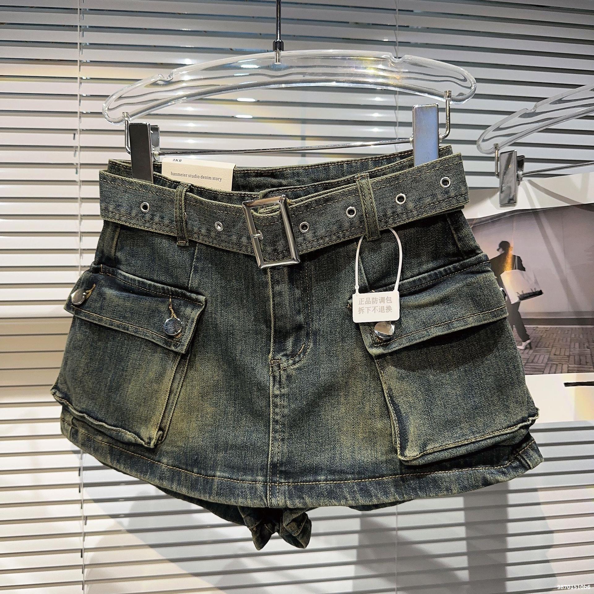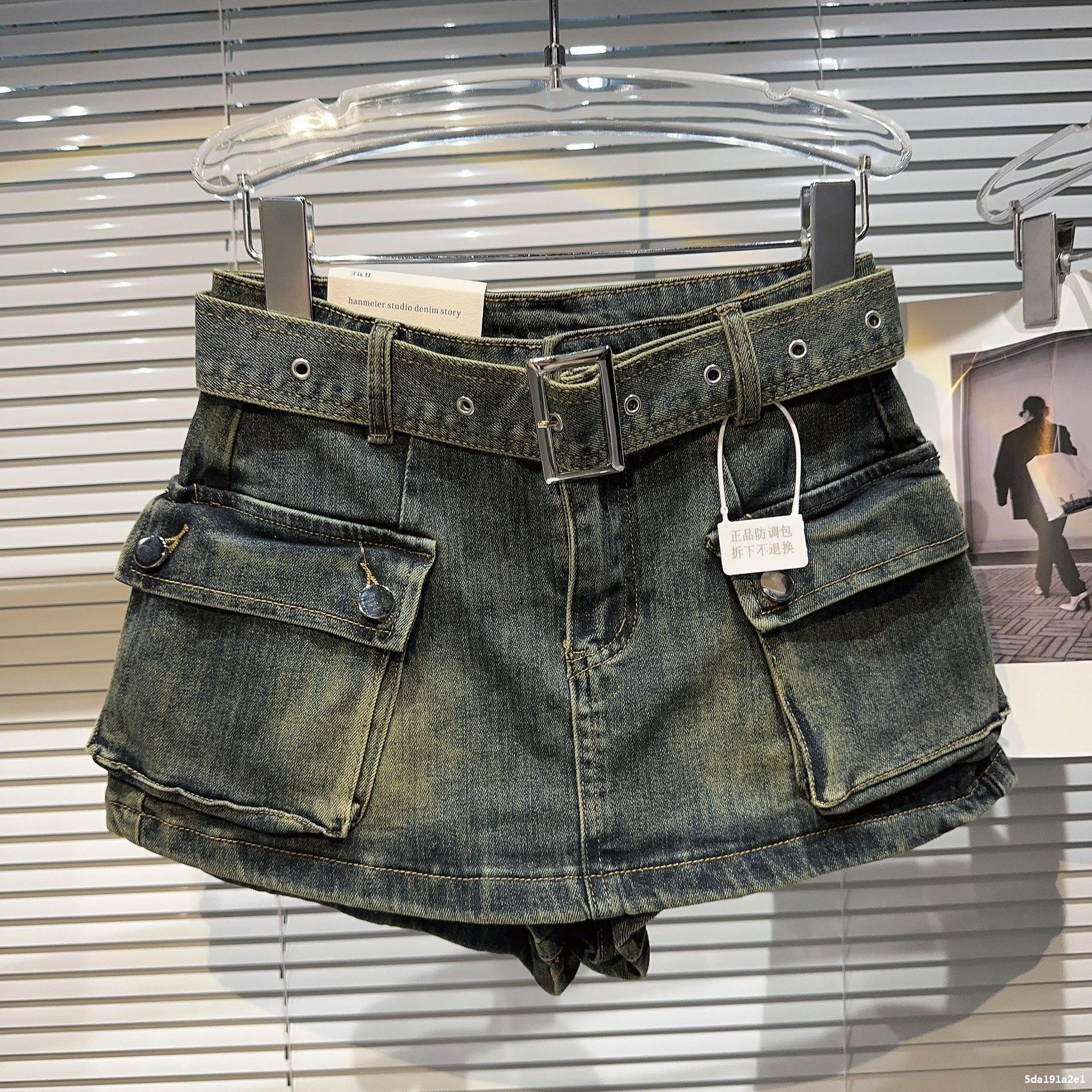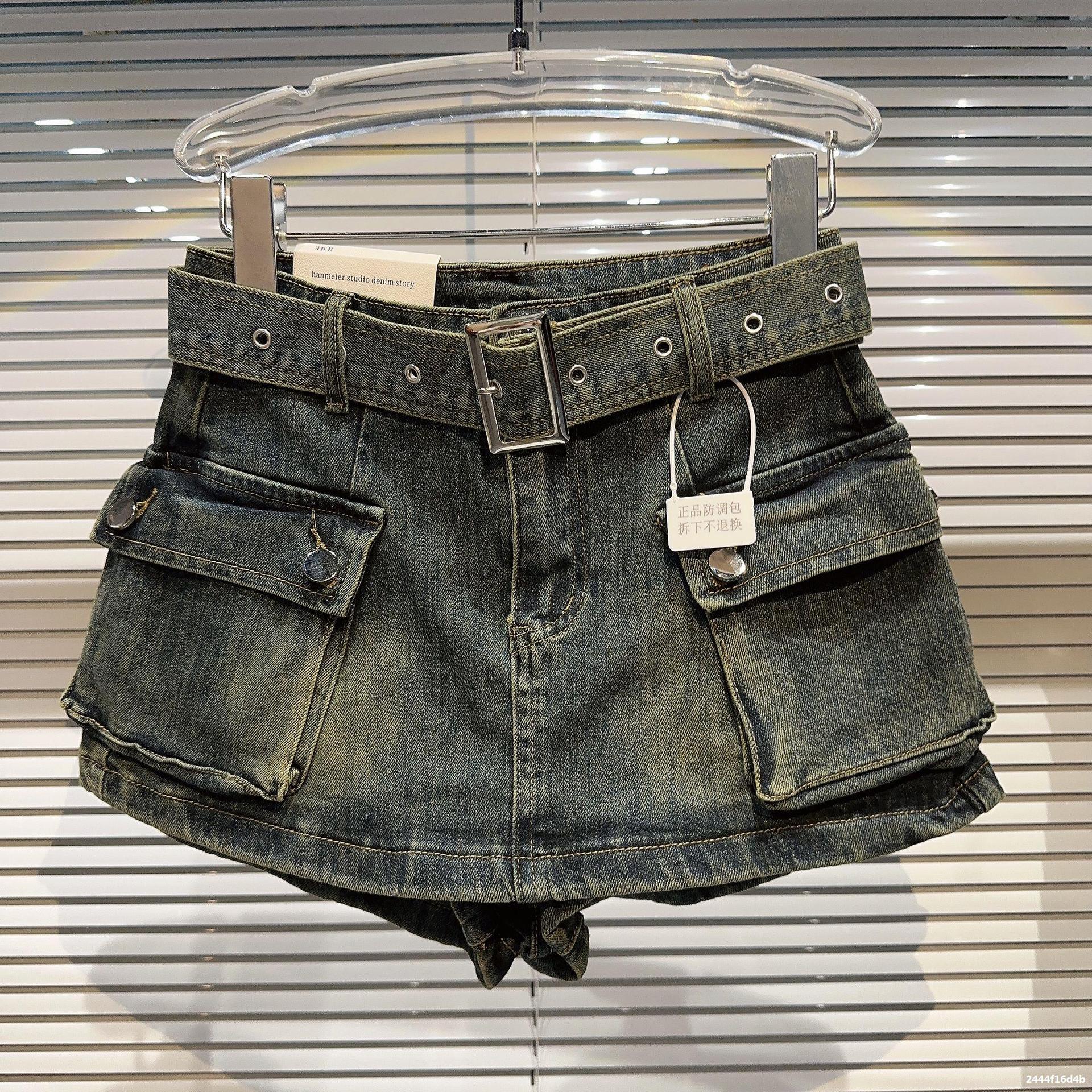 • Women's Fashionable Retro Large Pocket Belt Pantskirt Skirt Denim Shorts